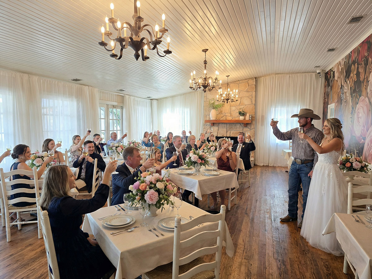 Our venue offers everything you need: the Flower Room indoor banquet space for climate-controlled comfort, a charming outdoor patio perfect for cocktails under the Texas sky, and tenting options that blend rustic beauty with polished style. Whether you envision 20 guests or 100, our wooded setting provides the privacy and romance that only nature can deliver.